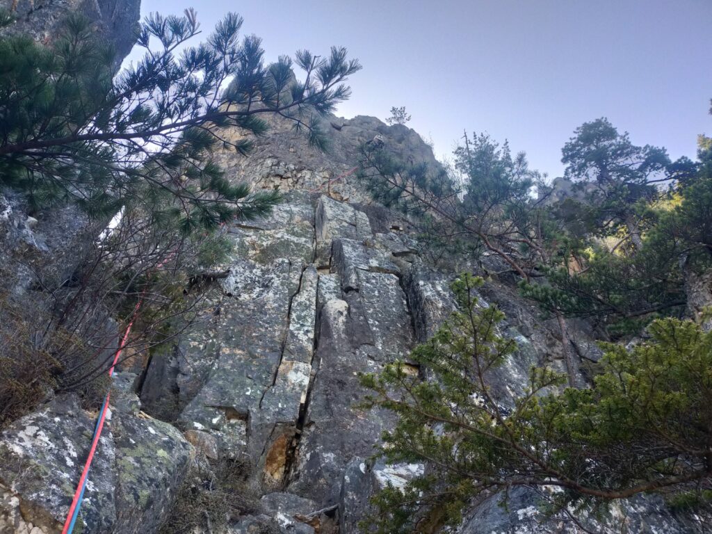 五ピッチ目、六ピッチ目と続く岩稜歩きや樹林帯(5.4)のピッチは、登攀のスピードを維持しつつ、身体を休ませるための静かな時間であった。