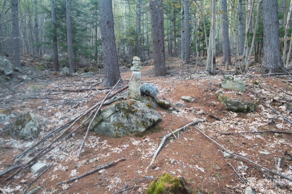 キャンプ場から踏み跡明瞭な道を辿り、烏帽子岩の取り付きへ。岩壁が目の前に迫ると、その量感に圧倒される。辺りにはケルンが積まれ、烏帽子岩を仰ぎ見ながらガレ場を詰めると、程なくして基部に到着した。既に先行者の姿も見え、緊張感が高まる。
