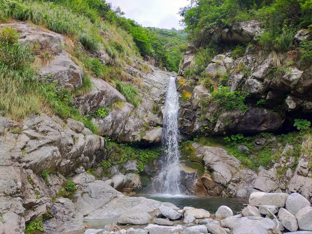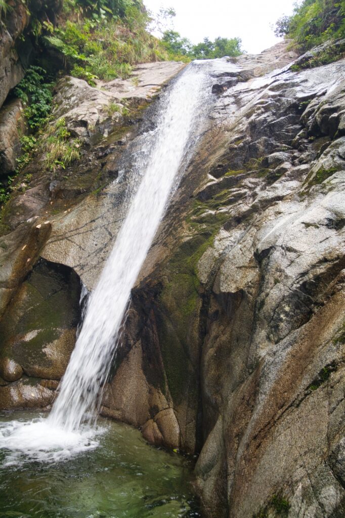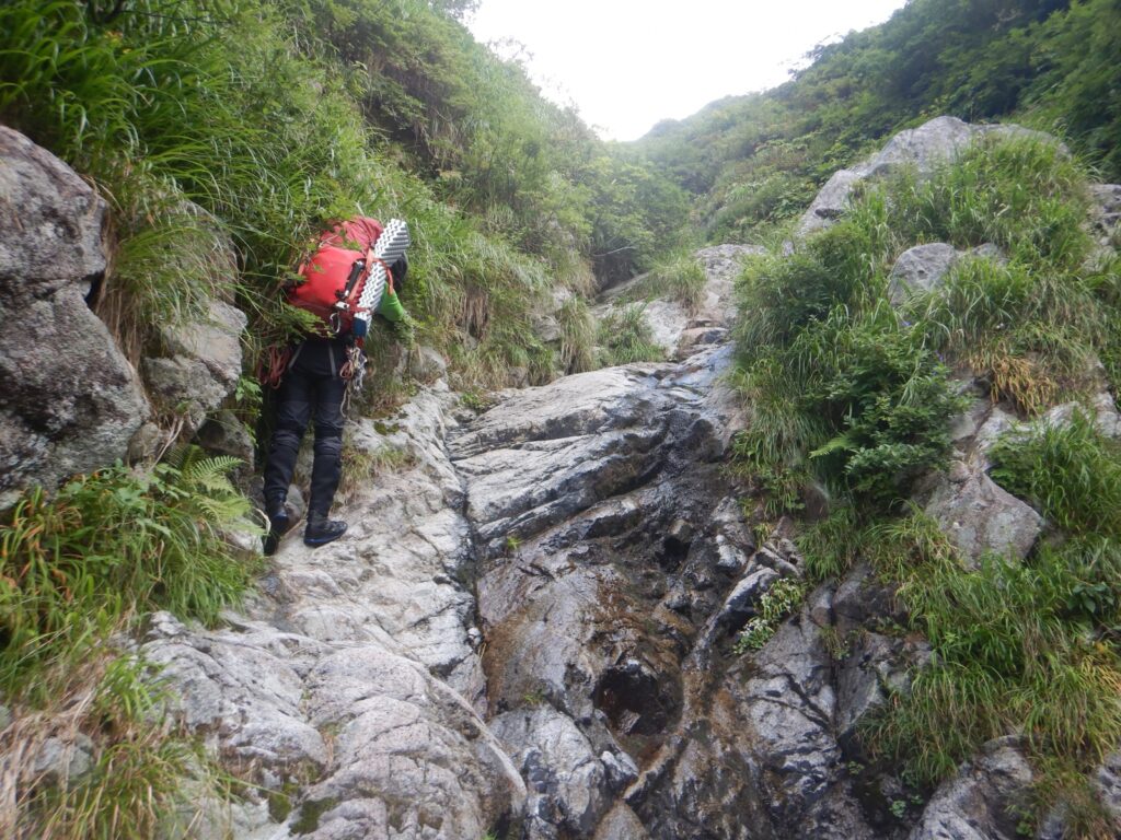 続いて六メートルのテロテロした滝。水量は少ないが、どうみても取り付けない。右岸から巻くことにした。七メートル滝も同様に左岸を巻き、残置された捨て縄から懸垂で下る。ザイルが濡れた岩肌を擦る音が響く。