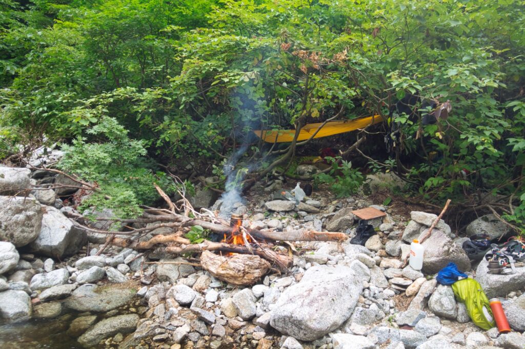 私はご飯を炊こうとコッヘルを火にかけたが、薪が崩れ不注意にも転倒させてしまった。白い米粒が河原の砂に散らばっていく。諦めて非常食のアルファ米を取り出す。味気ない夕食となったが、これも山の一興である。