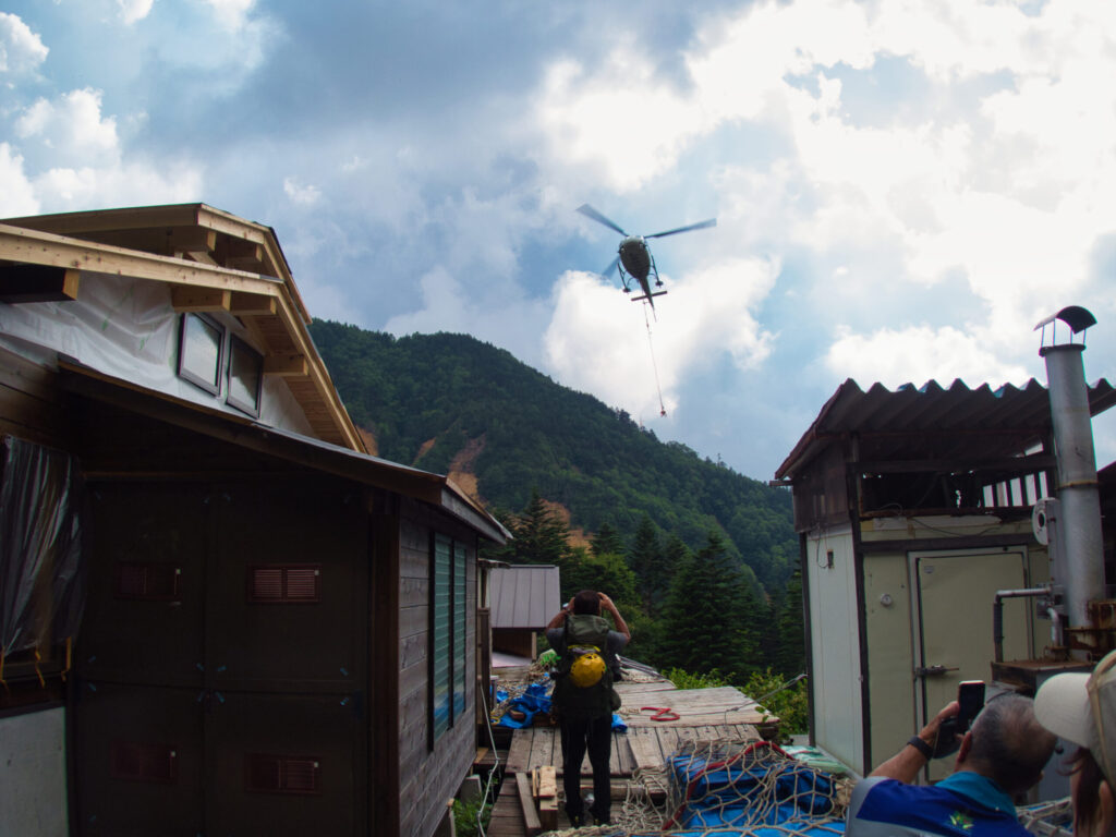 小屋の上空では、ヘリコプターが物資の荷揚げを繰り返していた。山小屋の運営も時代と共に変わる。かつては歩荷が担いだ荷を、今では空から運ぶ。そんな光景を眺めながら、初日の目的地に無事到着したことに安堵する。