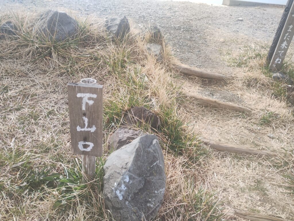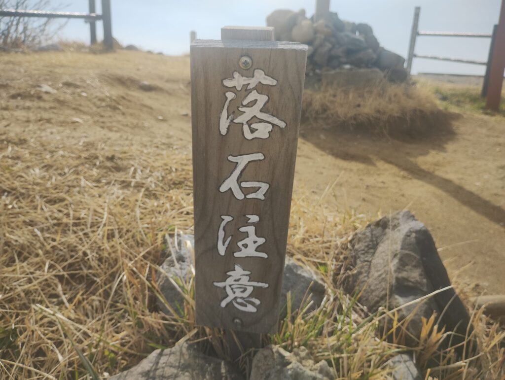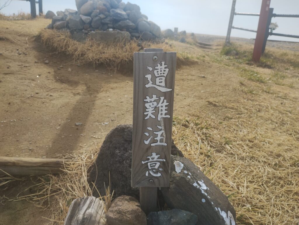 続いて「遭難注意」の標識。私はこの標識が設置されるに至った経緯を、深刻に受け止めた。エベレストのように、幾多の遭難者がこの地に命を刻んできたのであろう。三千ミリメートルの高みとはいえ、遭難は標高に比例しない。霧、風、方向感覚の喪失——ひとたび判断を誤れば、わずかな比高差が命取りになる。この一枚の標識を立てた者の経験と覚悟が、木の文字の裏に透けて見える。私は磁石の向きを再確認した。
