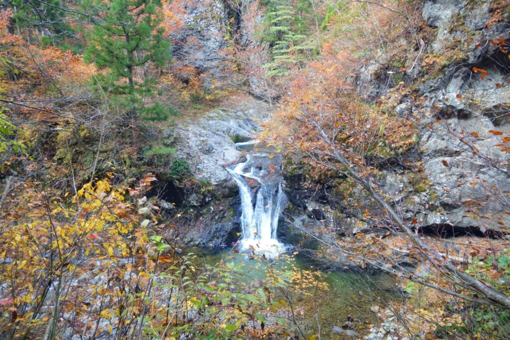 八丁洗板を下り、やがて八乙女滝の周辺に差し掛かった時、Sがなめこを見つけた。倒木に群生する小さなきのこ。晩秋の山の恵みである。