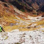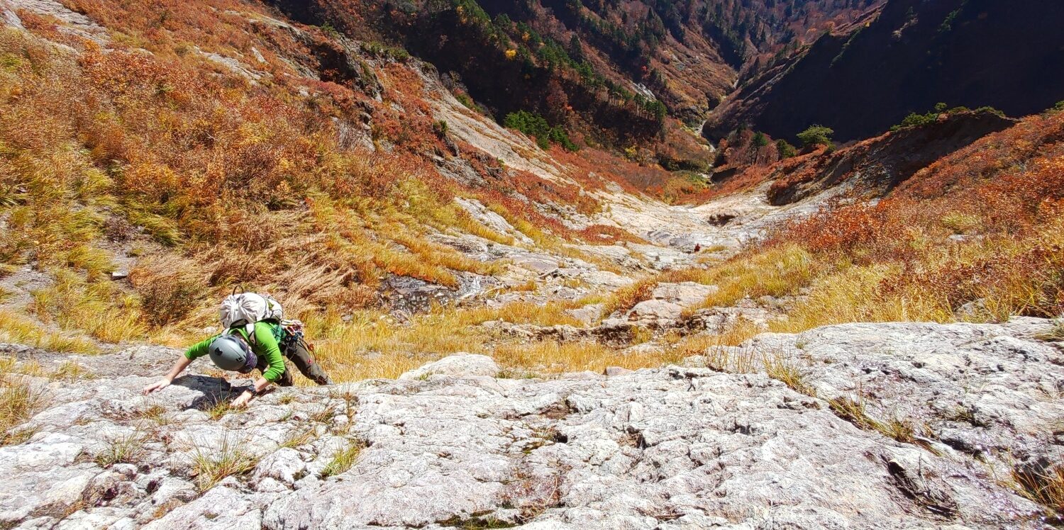 前ヶ岳南壁V字第二スラブは、技術的な難易度こそ高くないが、六百メートルに及ぶスケールの大きさと、開けたスラブの快適さが魅力である。眼下に広がる花崗岩の白い岩肌と、会越の紅葉。その景色は、登攀の疲労を忘れさせてくれた。