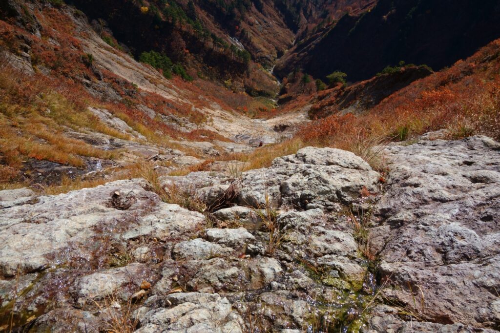 十一月六日、夜明けと共に出発する。八乙女滝を経て、八丁洗板と呼ばれる滑りやすい登山道を登っていく。紅葉は終盤を迎え、落ち葉が道を覆っていた。