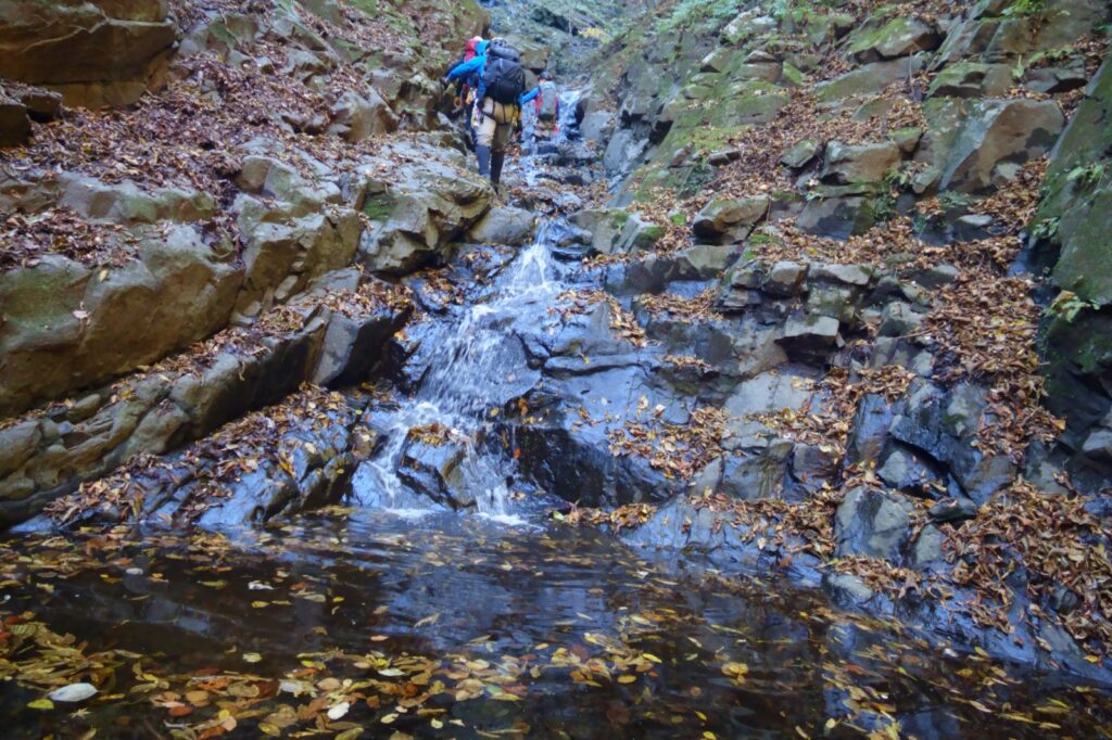 晩秋の裏妙義、中木川水系谷急沢右俣へ。ヒルの脅威から解放された十一月の渓は、紅葉と柱状節理の岩壁が織りなす美しい世界だった。講習会の参加者として、ガイド仲間たちと共に遡行した一日の記録。