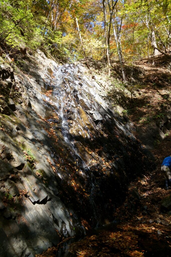 さらに高度を上げると、十五メートルの滝が姿を現した。本日の核心部である。柱状節理の柱が幾重にも重なり、独特の景観を作り出している。錦秋の紅葉を背景に、灰色の岩壁が屹立する様は、まさに裏妙義らしい荒々しさと美しさの調和であった。