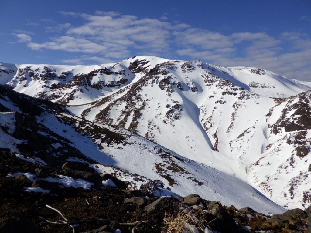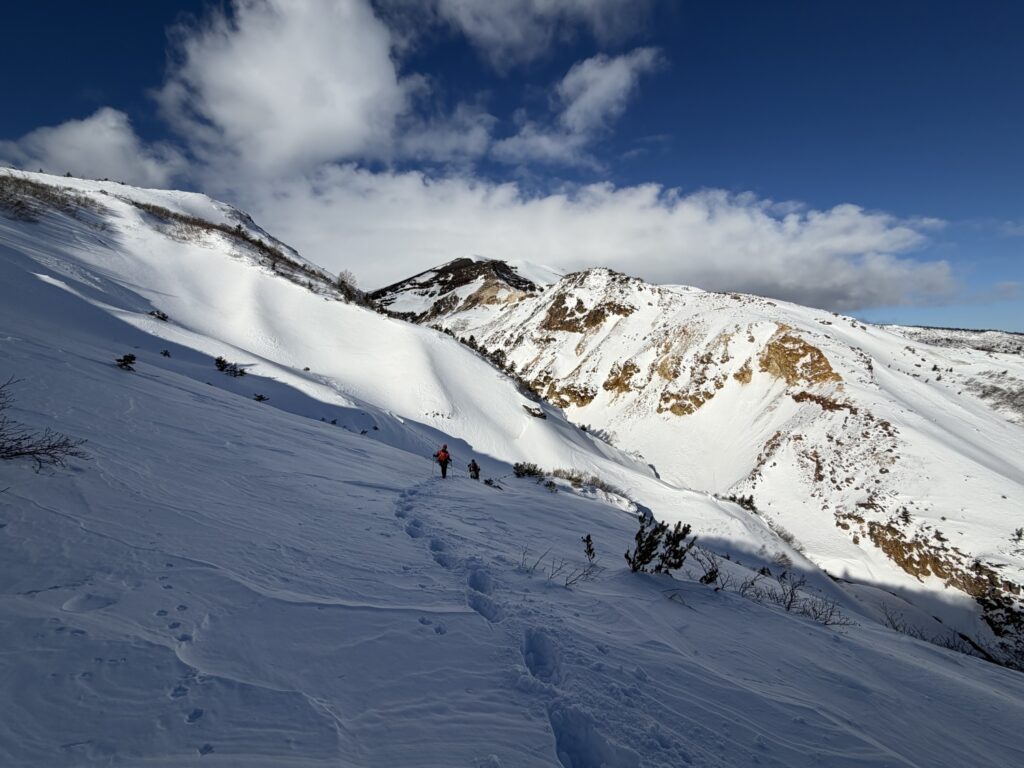 刈田岳の山容が眼前に広がる。雪を纏ったその姿は、白磁の肌のように滑らかで美しい。だが、今はその景色を楽しむ余裕はない。目の前の岩稜に全神経を集中させる。