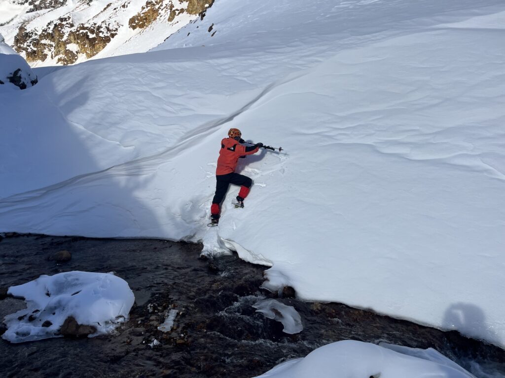渡渉を試みた。ワカンを履いたまま、慎重に足を踏み出す。その瞬間、足元の雪が崩れた。