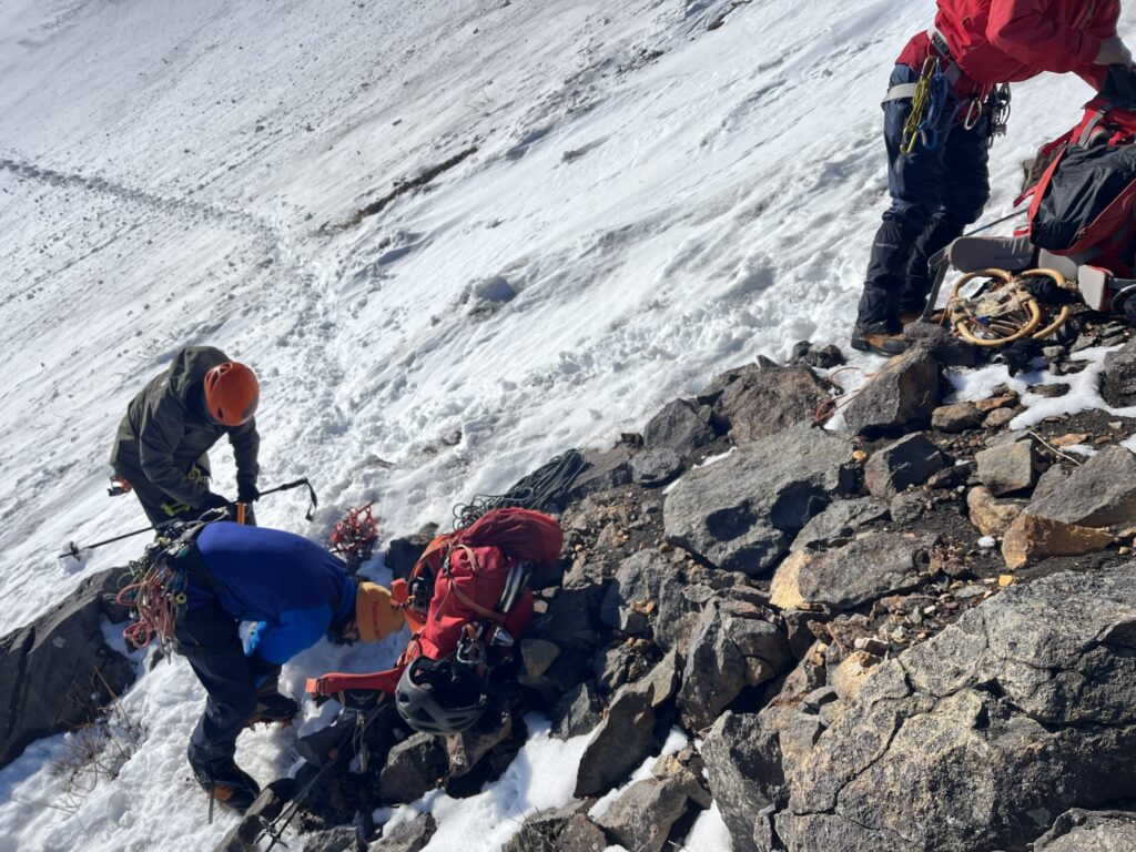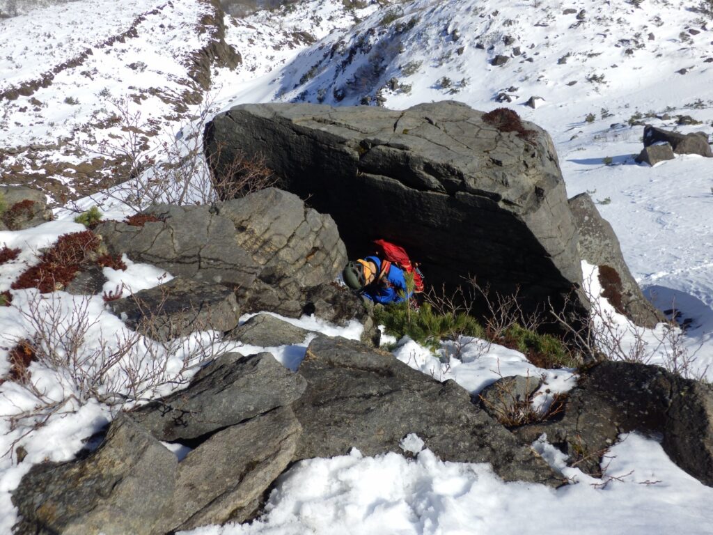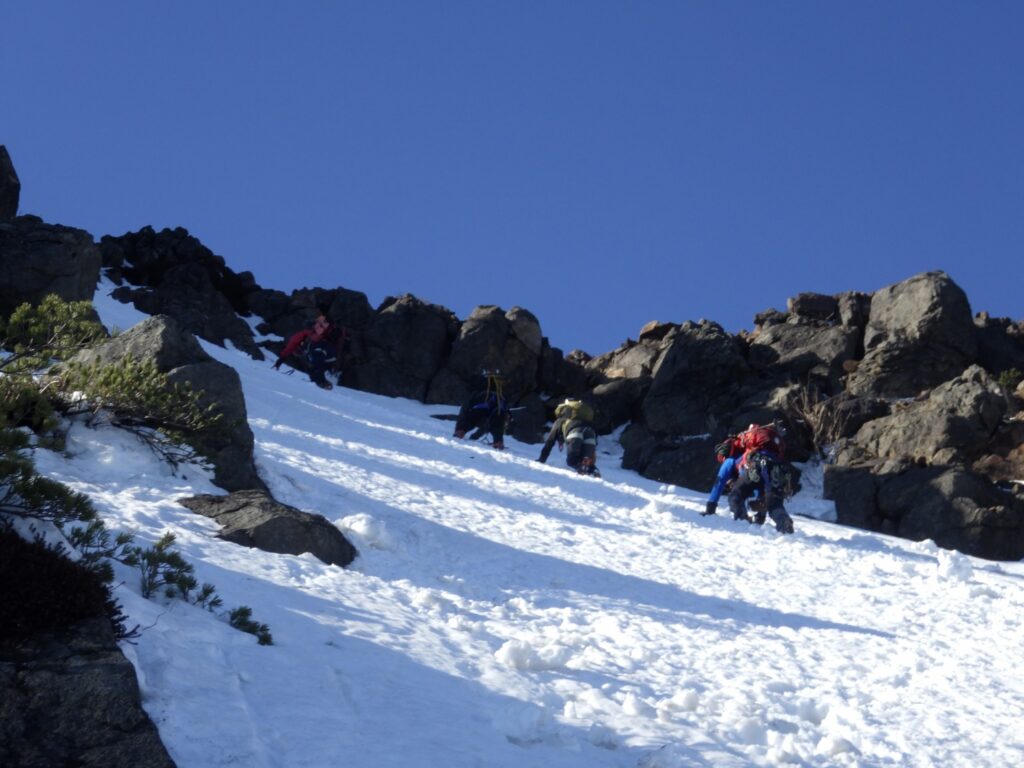 雪だんごがアイゼンに付着し、フットワークが不安定になる。岩に足を置いた瞬間、滑る感覚。恐怖を感じた。立ち止まり、片手で岩を掴みながら、もう片方の手でピッケルの石突きを使って丁寧に雪を落とす。バランスを崩さないように、慎重に。この作業を、登攀中に何度も繰り返す。