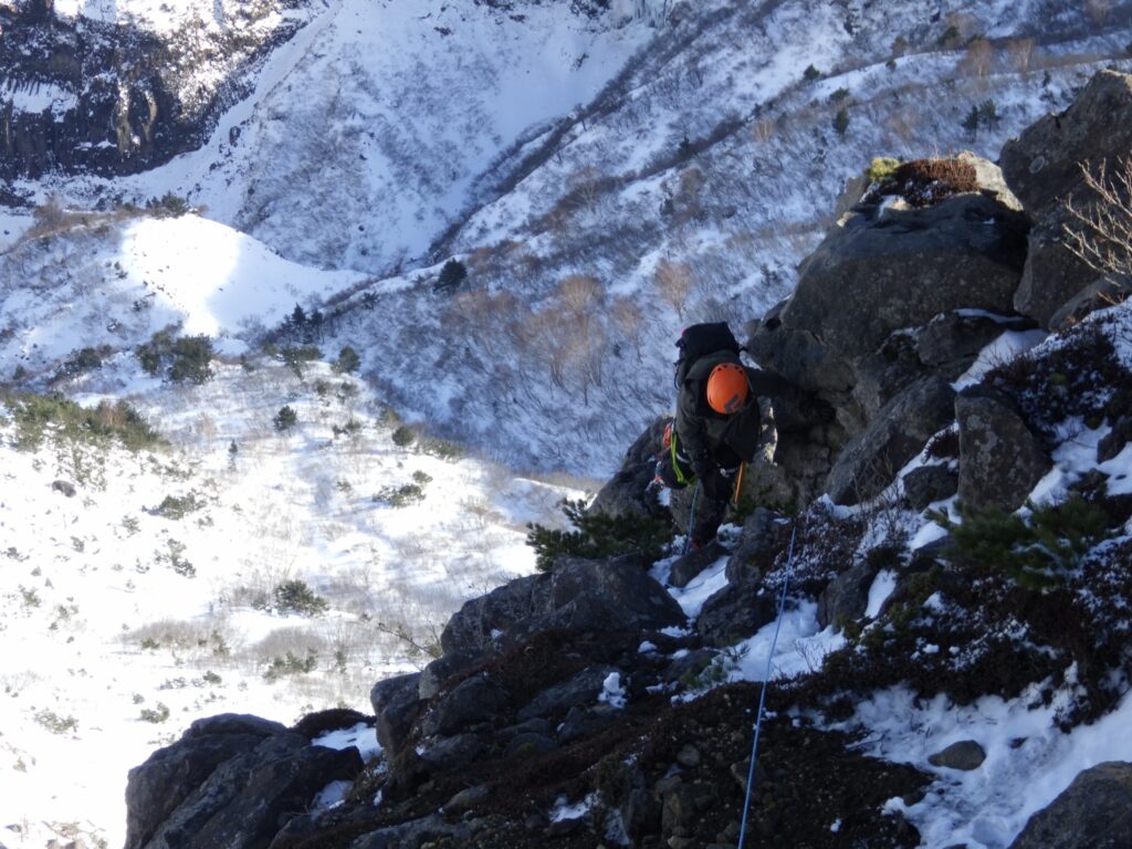 核心部の岩稜が眼前に立ちはだかる。高さは十メートルほどか。花崗岩の岩壁である。雪と氷に覆われているが、所々に岩肌が露出している。Sが先行し、ロープを伸ばしていく。彼の動きを見守る。