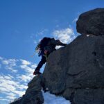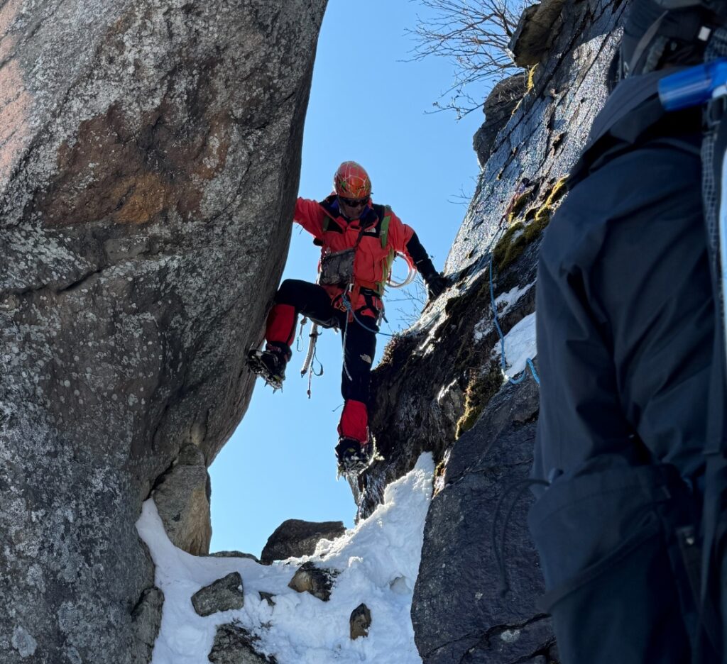 私の番が来た。手袋越しに岩の冷たさが伝わる。花崗岩の粒子が指先に感じられる。ホールドを探り、確実に体重を預けられるかを確認する。足元のアイゼンの爪を岩の窪みに慎重に置く。前爪が岩を噛む感触。一手一手が緊張を伴った。