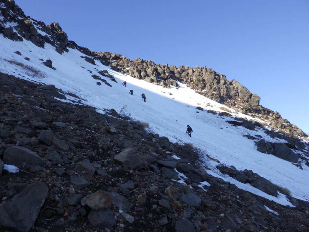 下降は登攀とは対照的に、雪のルンゼを選んだ。登ってきた岩稜を下るよりも、こちらの方が安全である。リスクを最小限にする判断だ。